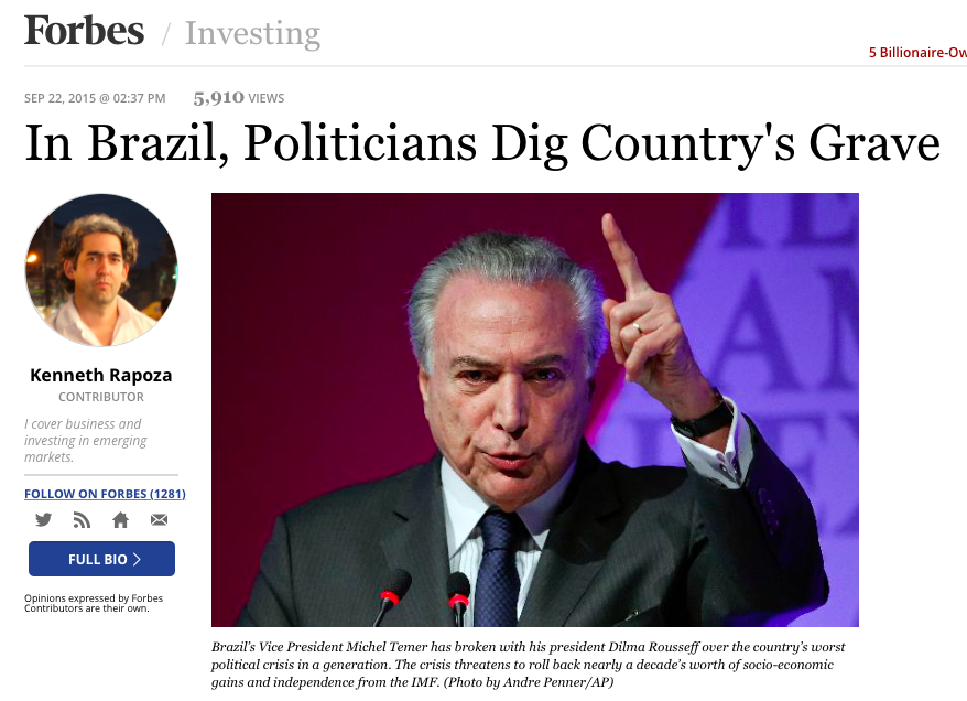 “A crise política no Brasil pode ter começado com o governo do Partido dos Trabalhadores e a estatal de energia Petrobras. Mas desde que a Polícia Federal agiu de forma histórica e prendeu oligarcas intocáveis do país, e que políticos da coalizão como o presidente da Câmara, Eduardo Cunha, foram considerados suspeitos de corrupção, todo o aparato político brasileiro está uma bagunça”, diz o autor do artigo, Kenneth Rapoza.